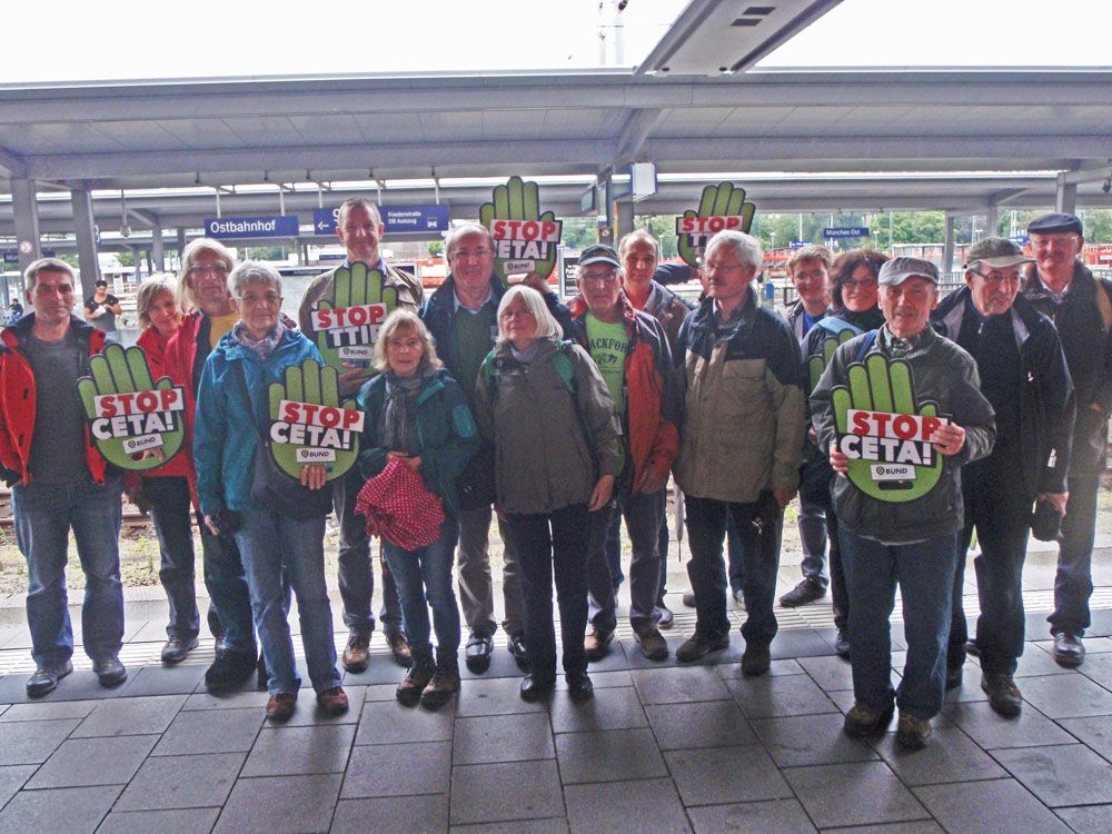 Trotz strömenden Regens folgten über 20 Teilnehmer dem Demo-Aufruf der BN-Kreisgruppe zur CETA/TTIP-Demo am 17.9. nach München mit Anreise per Bahn. Teilnehmer der Kreisgruppe waren u.a. Dr. Jürgen Riedler, Anne Hennersperger und Günter Schmidt, der die Simbacher Zuggruppe dankenswerterweise organisierte. Ab Mühldorf erfolgte dann die gemeinsame Weiterreise zur Demo mit mehr als 25.000 Menschen. Dort wurde gefordert: "Die Bevölkerung will weder TTIP noch CETA. Sowohl die bayerische Staatsregierung als auch die Bundesregierung müssen endlich die Notbremse ziehen und das Nein der Bürgerinnen und Bürgerinnen zu CETA und TTIP respektieren."
