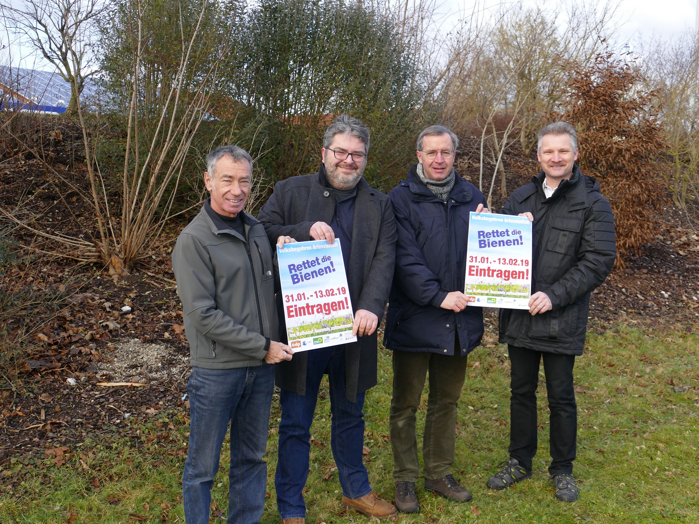 Pfarrkirchen. In der am 15. November durchgeführten Jahreshauptversammlung der Kreisgruppe, die auch einen Rechenschaftsbericht der Vorstandschaft umfasste, stand vor allem ein hochaktuelles Referat im Mittelpunkt: Johannes Selmansberger, selbst aktiver Imker und Naturschutz-Fachmann, berichtete im Rahmen seines Vortragsthemas „Es verstummt das Summen der Bienen – wie kann die Honigbiene überleben?“ über die Ursachen und die Folgen des Rückganges der Bienen-Populationen. Er machte auch darauf aufmerksam, was in den Bereichen Landbewirtschaftung und Lebensraumgestaltung sowie im Hausgarten dringend getan werden muss, um den Honig- und Wildbienen das Überleben zu sichern (Lesen Sie hier mehr). Nach der Jahreshauptversammlung 2017 dankte BN-Kreisvorsitzender Matthias Schmöller (2. v. rechts) dem Referenten, Johannes Selmansberger, für seinen informativen Vortrag über die Gefährdung der Bienen-Populationen. Mit dabei auch der stellvertretende BN-Kreisvorsitzende, Dr. Jürgen Riedler (links) und der 2. Bürgermeister Pfarrkirchens sowie CSU-Kreisvorsitzender Martin Wagle (rechts).