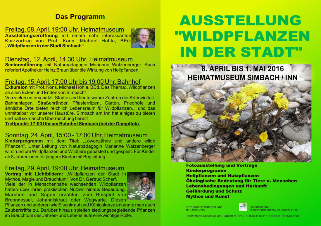 Als bislang großer Erfolg zeigt sich die Ausstellung "Wildpflanzen in der Stadt" im Heimatmuseum Simbach. Insgesamt will die Ausstellung mit Texten, Bildern und Exponaten auf die vielfältige Bedeutung der Wildpflanzen in der Stadt hinweisen. Noch aktuell ist am Sonntag, 24. April, von 15 bis 17 Uhr wieder im Heimatmuseum ein Kinderprogramm mit dem Titel: „Löwenzähne und andere wilde Pflanzen“. Unter Leitung von Naturpädagogin Marianne Watzenberger wird rund um Wildpflanzen und Wildtiere gebastelt und gespielt. Geeignet für Kinder ab 8 Jahren oder für jüngere Kinder mit Begleitung. Den Abschluss findet das Begleitprogramm am Freitag, 29. April, um 19 Uhr im Heimatmuseum mit einem Vortrag von Dr. Gertrud Scherf unter dem Titel „Wildpflanzen der Stadt in Mythos, Magie und Brauchtum“. Hier nebenstehend das Programm zur Ansicht. Klick vergrößert.