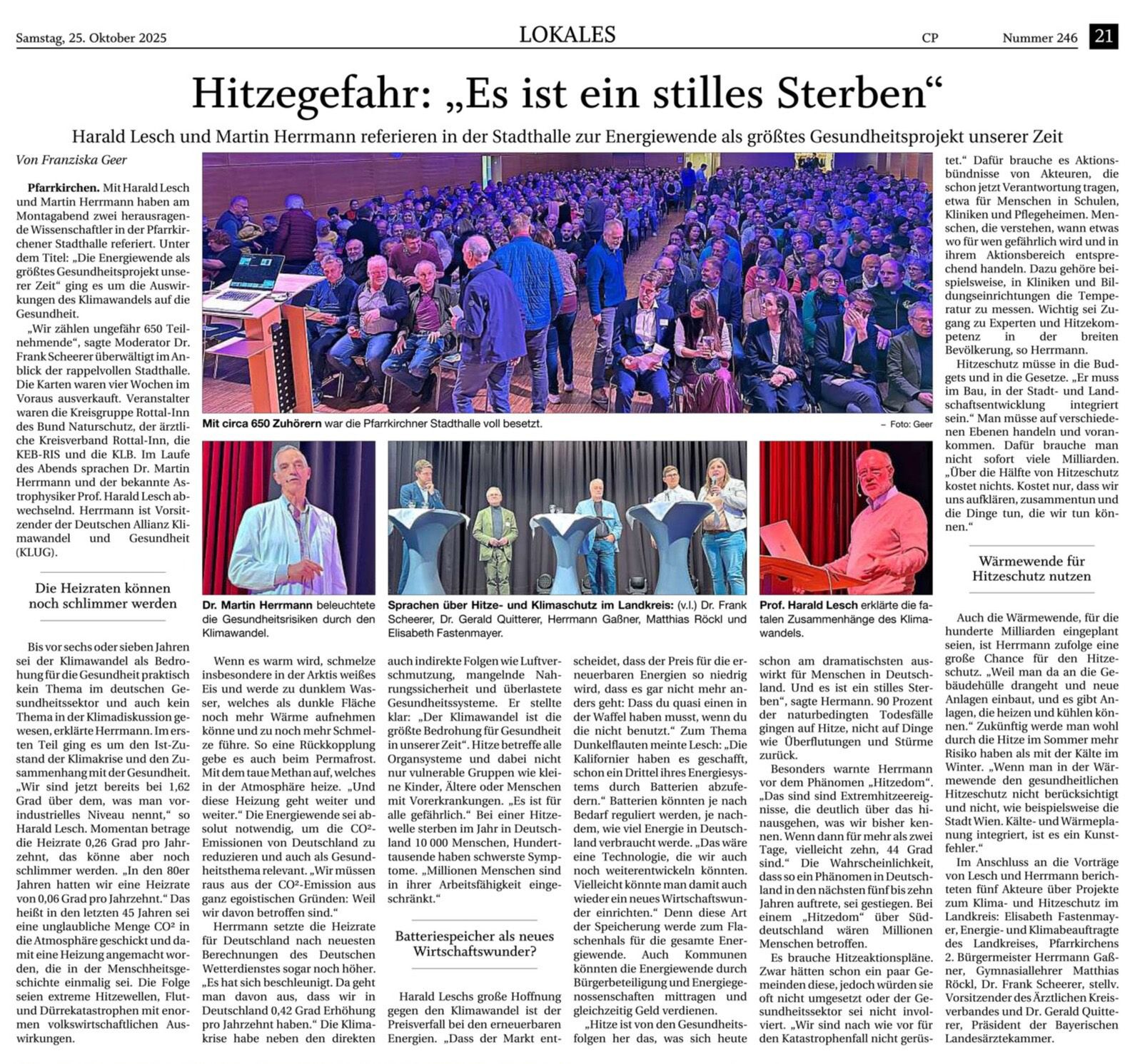 In diesem Zusammenhang ging der Referent auch mit dem menschlichen Verhalten ins Gericht: „Global betrachtet gibt es immer mehr Menschen, die – allen voran die Bevölkerung der Industrienationen – für immer weniger Geld immer mehr und unterschiedliche Waren besitzen wollen. Diese Gier führt einerseits zur Ausbeutung von Menschen, zu Tierquälerei und zu einem Raubbau bald auch der letzten Ressourcen unseres Planeten. Letztlich ist heutzutage der Wachstums-Begriff mit einer Zerstörung unserer Lebensgrundlagen eng verkoppelt. Das kann und darf nicht so weitergehen. Die Beanspruchung der Natur müsste erheblich mehr in Kostenbilanzen einbezogen werden, Politik und Wirtschaft arbeiten aber Hand in Hand hier dagegen. Wenn wir uns alle nicht mäßigen, gerät unser ganzes Lebensumfeld aus den Fugen. Übrigens hat selbst Ludwig Erhard schon 1957 zur Mäßigung aufgerufen, sicher all diese Negativ-Aspekte schon ahnend.“