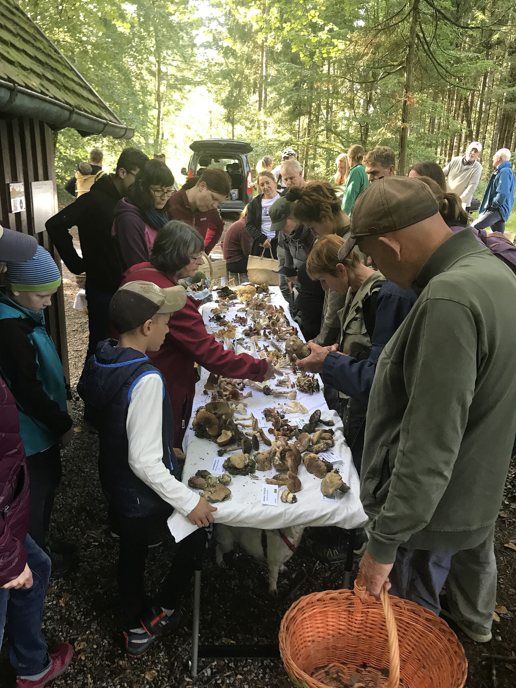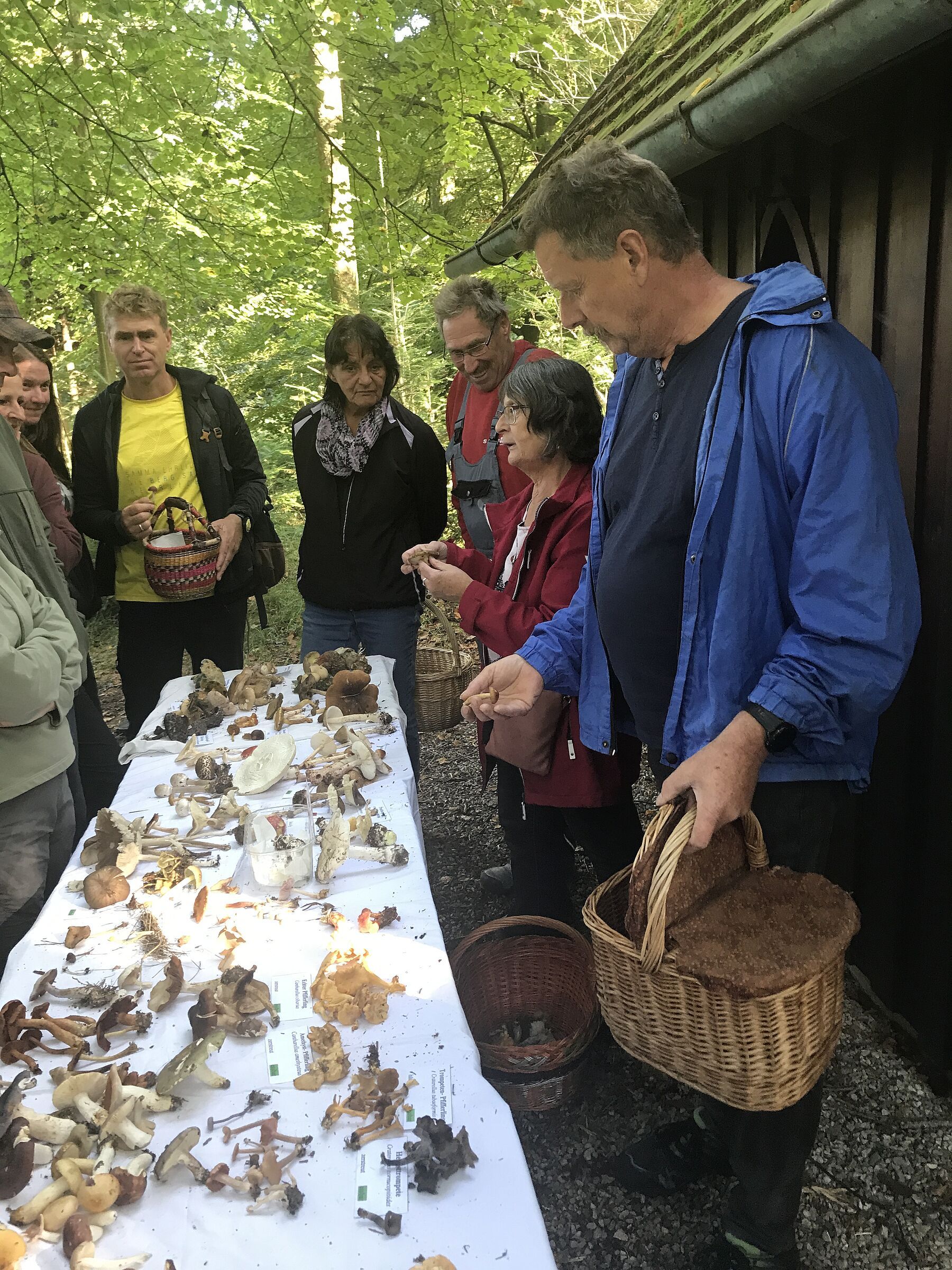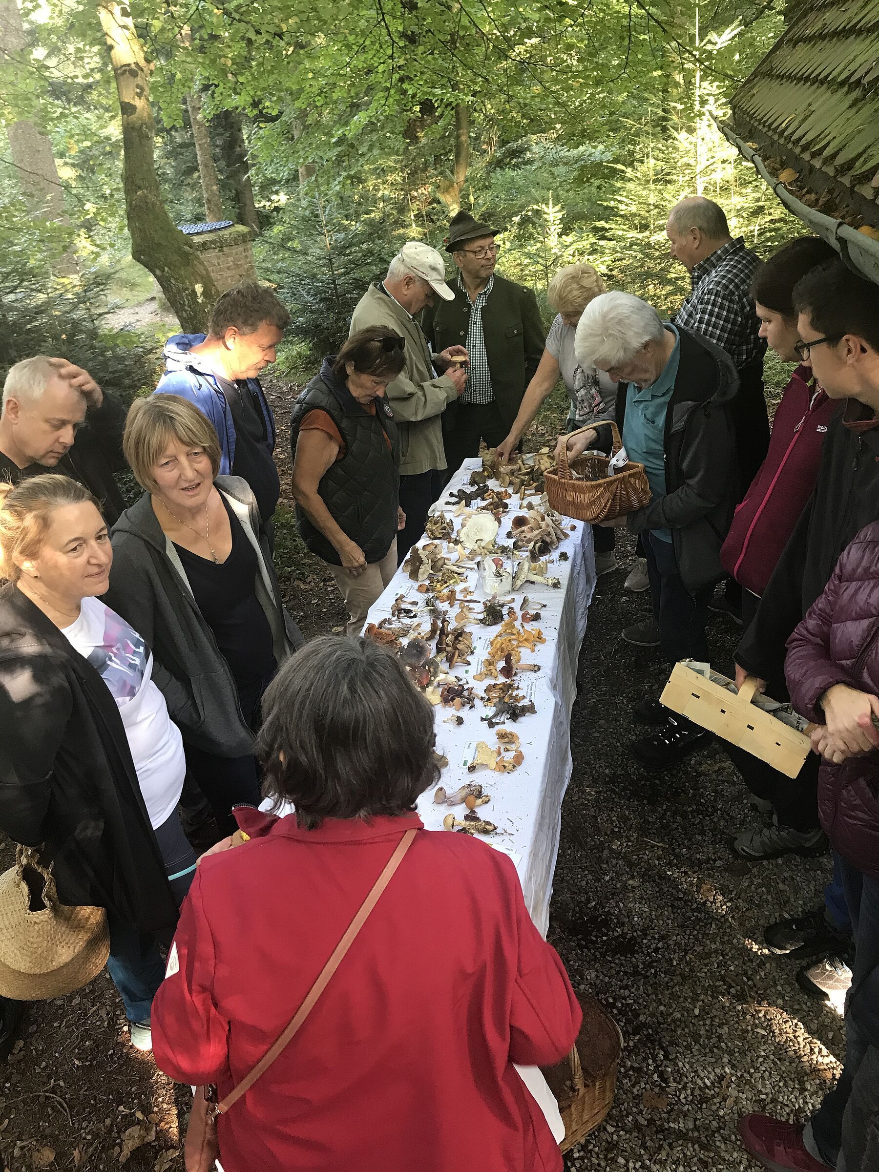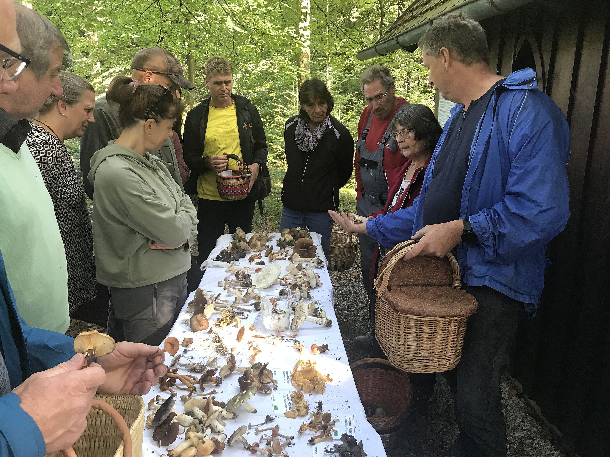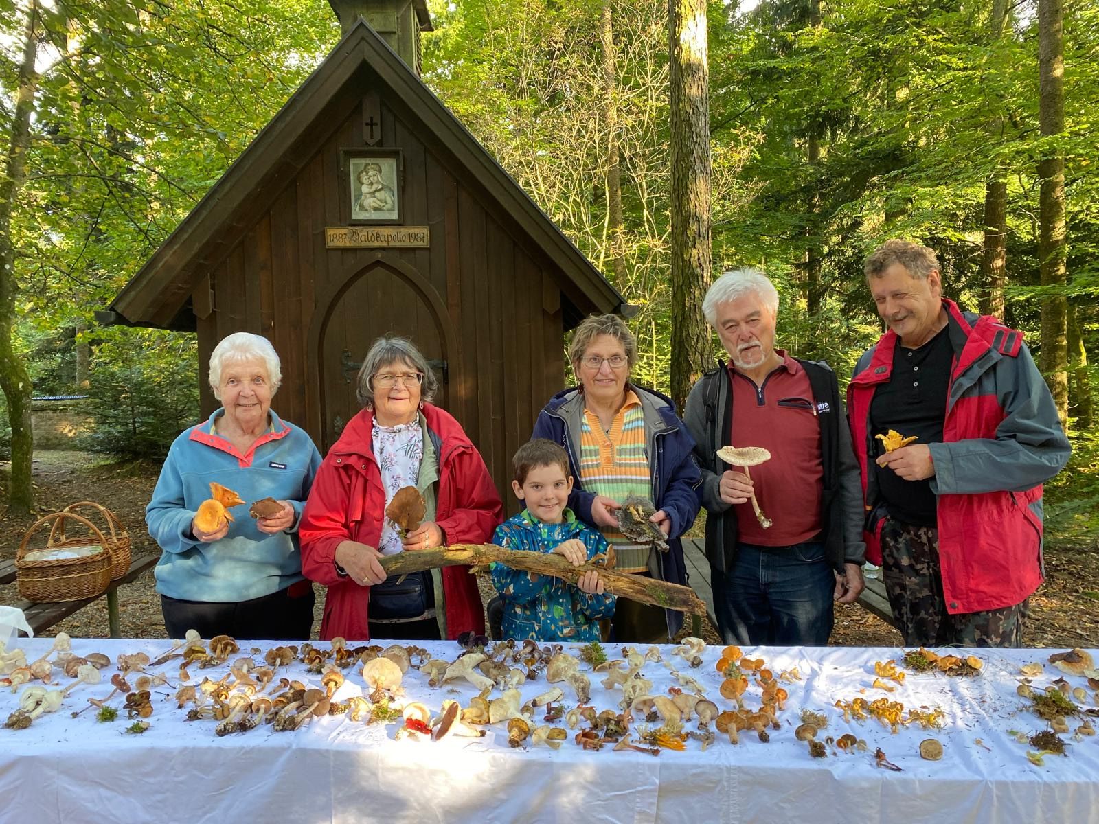 Nach rund zwei Stunden trafen sich alle Teilnehmer wieder an der Kapelle, dort wurden dann alle Funde auf einem großen Tisch ausgelegt und bestimmt. Es wurde auch besprochen, welche Pilze sich als Mahlzeit eignen und wie man sie optimal zubereitet.